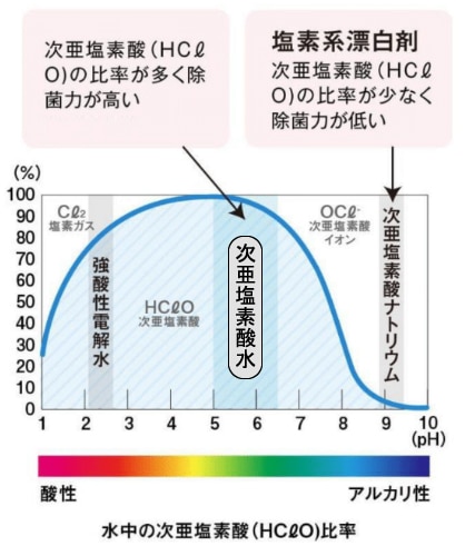 次亜塩素酸水のなかでも、微酸性次亜塩素酸水は最も中性に近いpH5.0~6.5。人間の肌のpH値に近いので人体への危険性も少なく格段に安全とされています。 2002年に「人の健康を損なう恐れがない」ということから食品添加物に指定され、飲食店などでも使用されています。